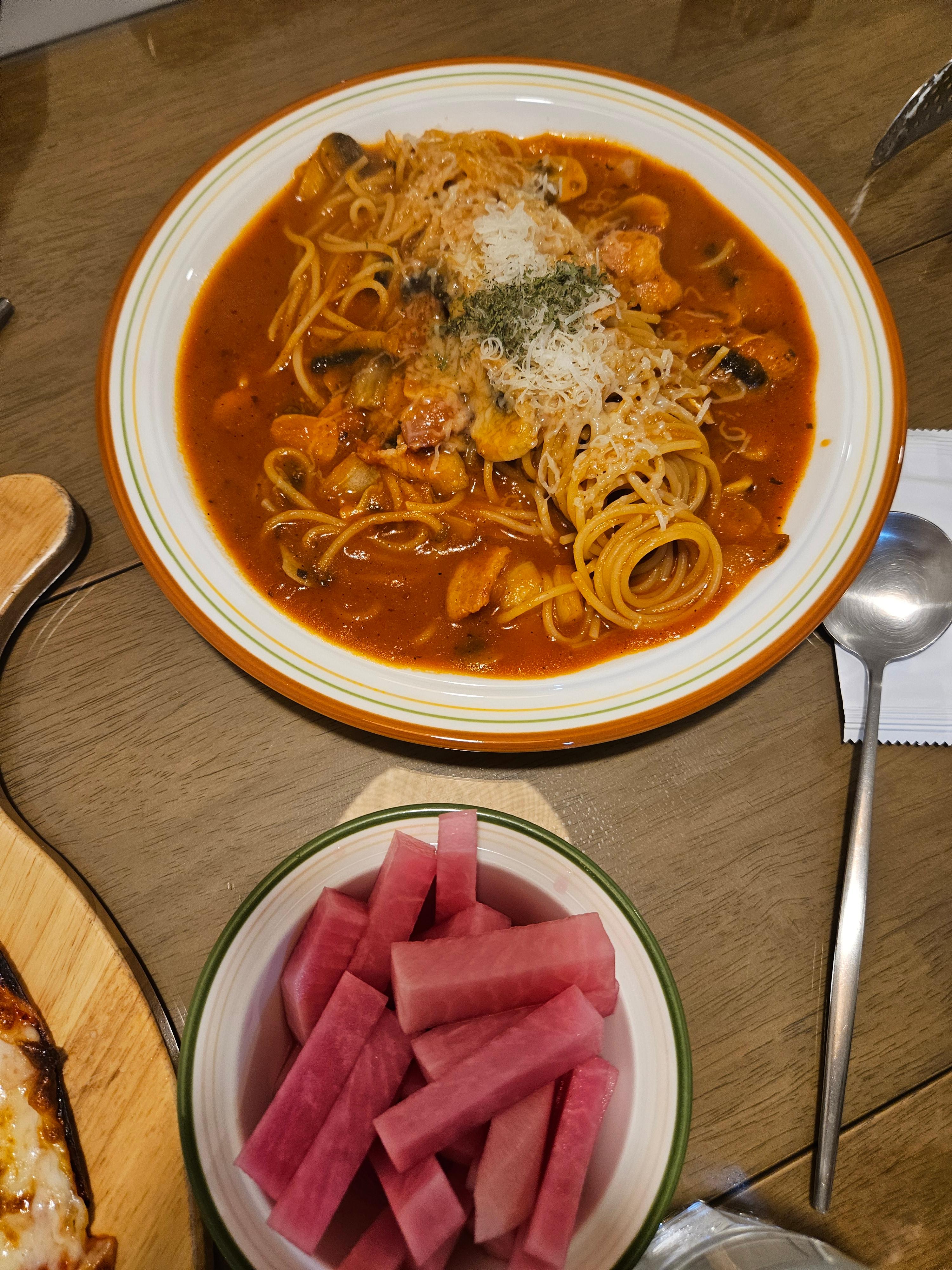 칠리토마토 파스타는 약간 매콤해서 느낌함 없이 깔끔하고 맛있는데 포테이토 피자와 궁합도 잘 맛는 조합이었어요.