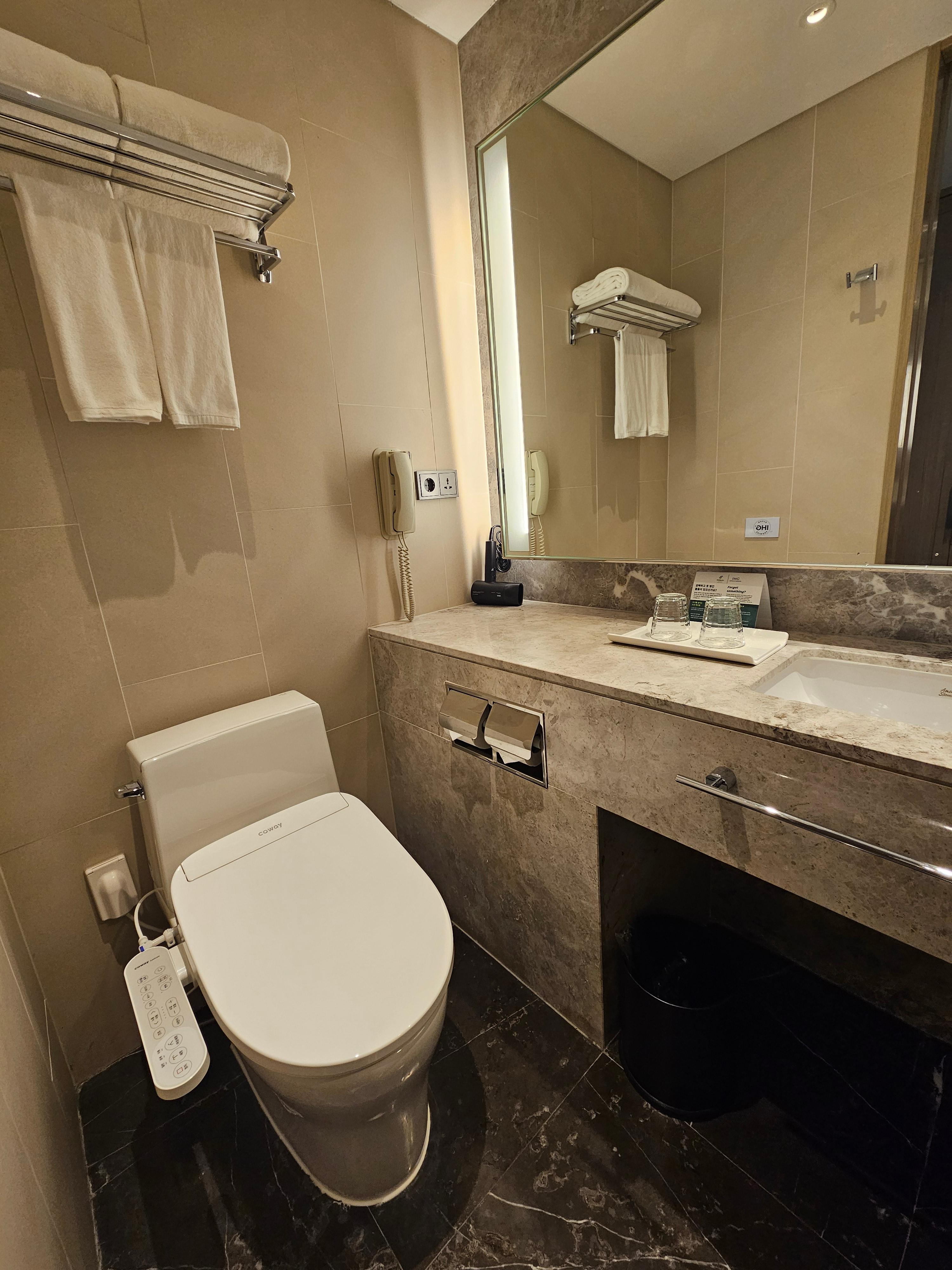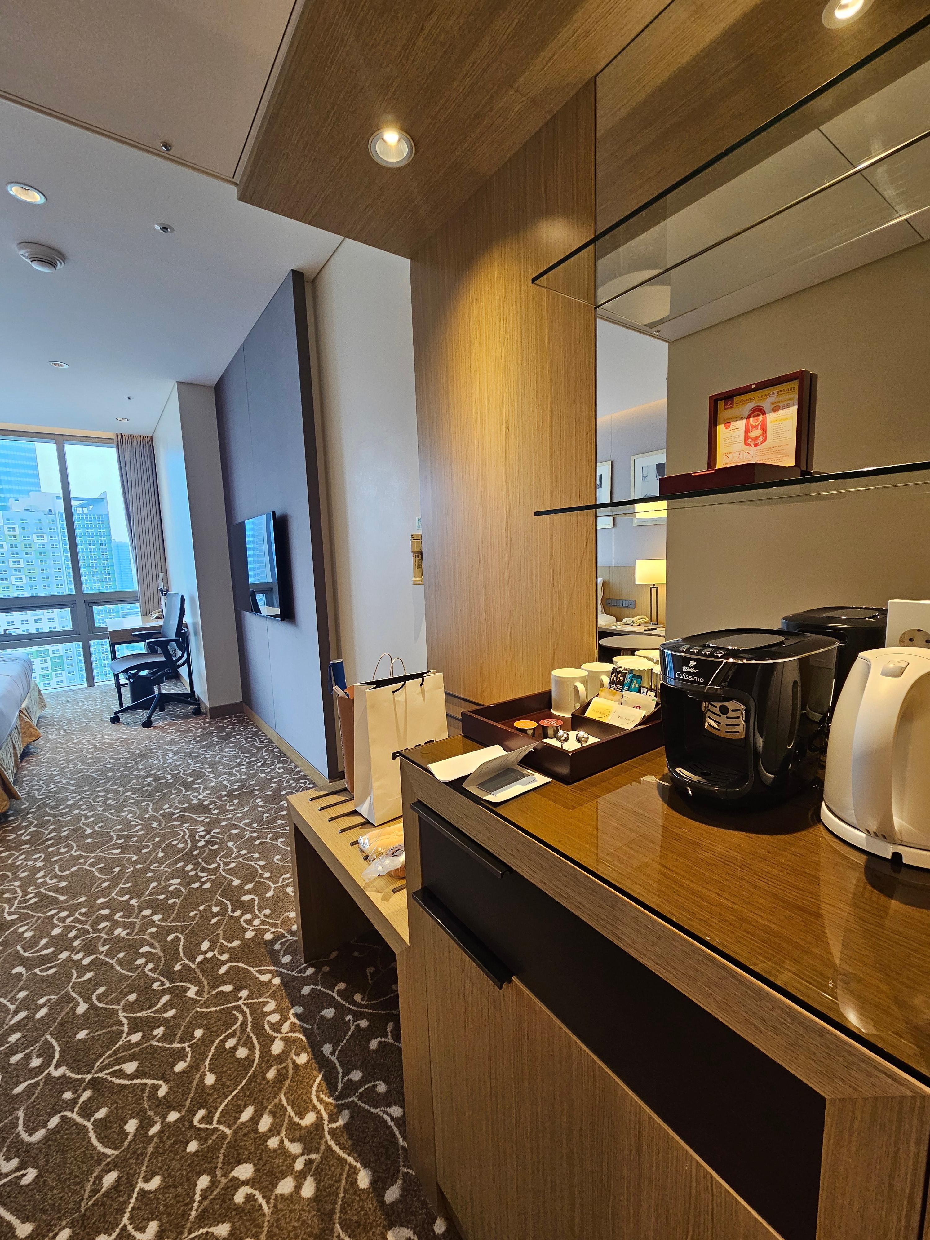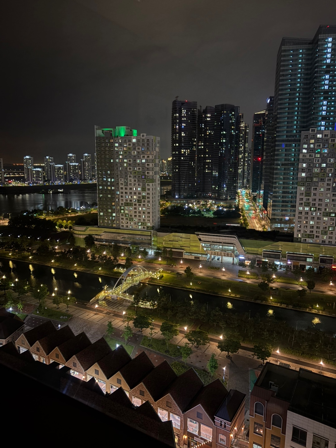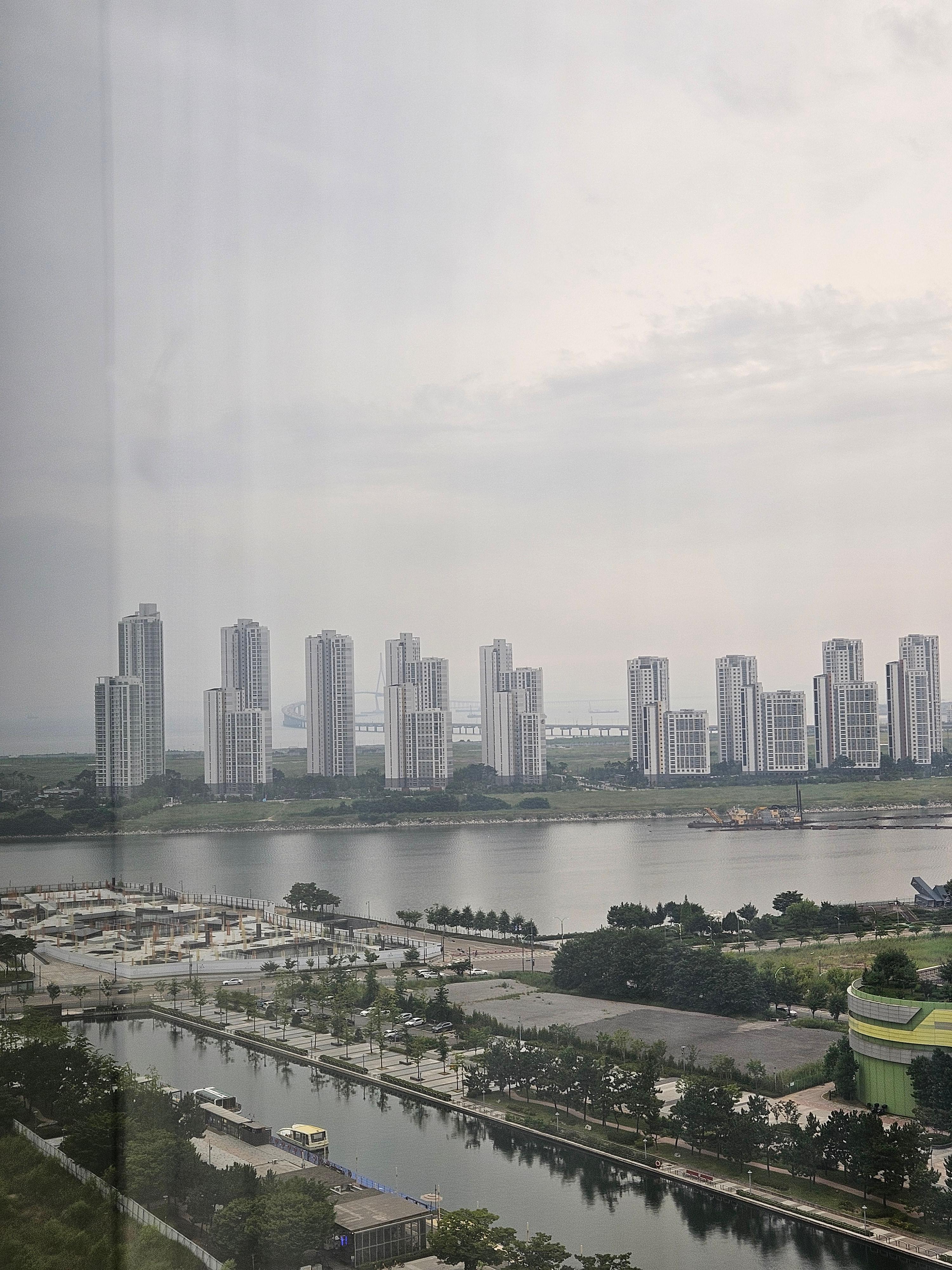 객실은 냄새도 안나고 쾌적하고 밝고 맘에 쏙 들었어요. 침대는 프리미엄 킹 사이즈(?) 엄청 커서 성인 4명도 함께 누울수 있는 크기에 깨끗하고 모던한 분위기였어요. 넓은 통유리 창으로 보이는 송도 센트럴파크 전망은 정말 멋졌어요. 딸이 창가에 앉아 사진 찍느라 정신이 없었답니다.