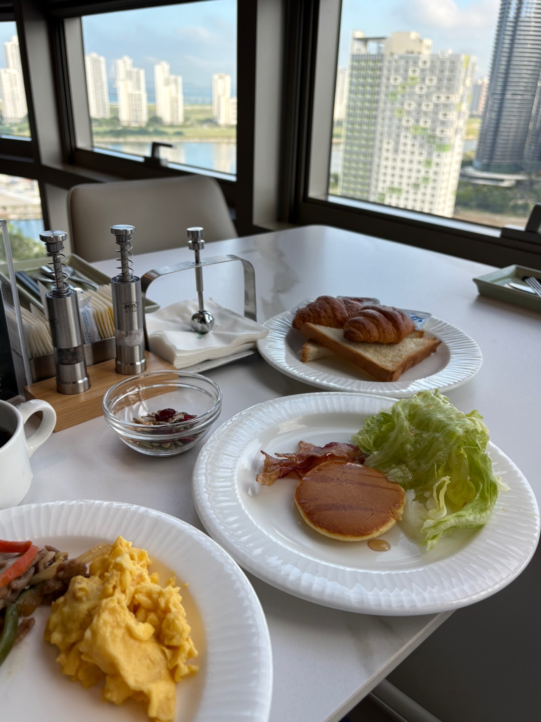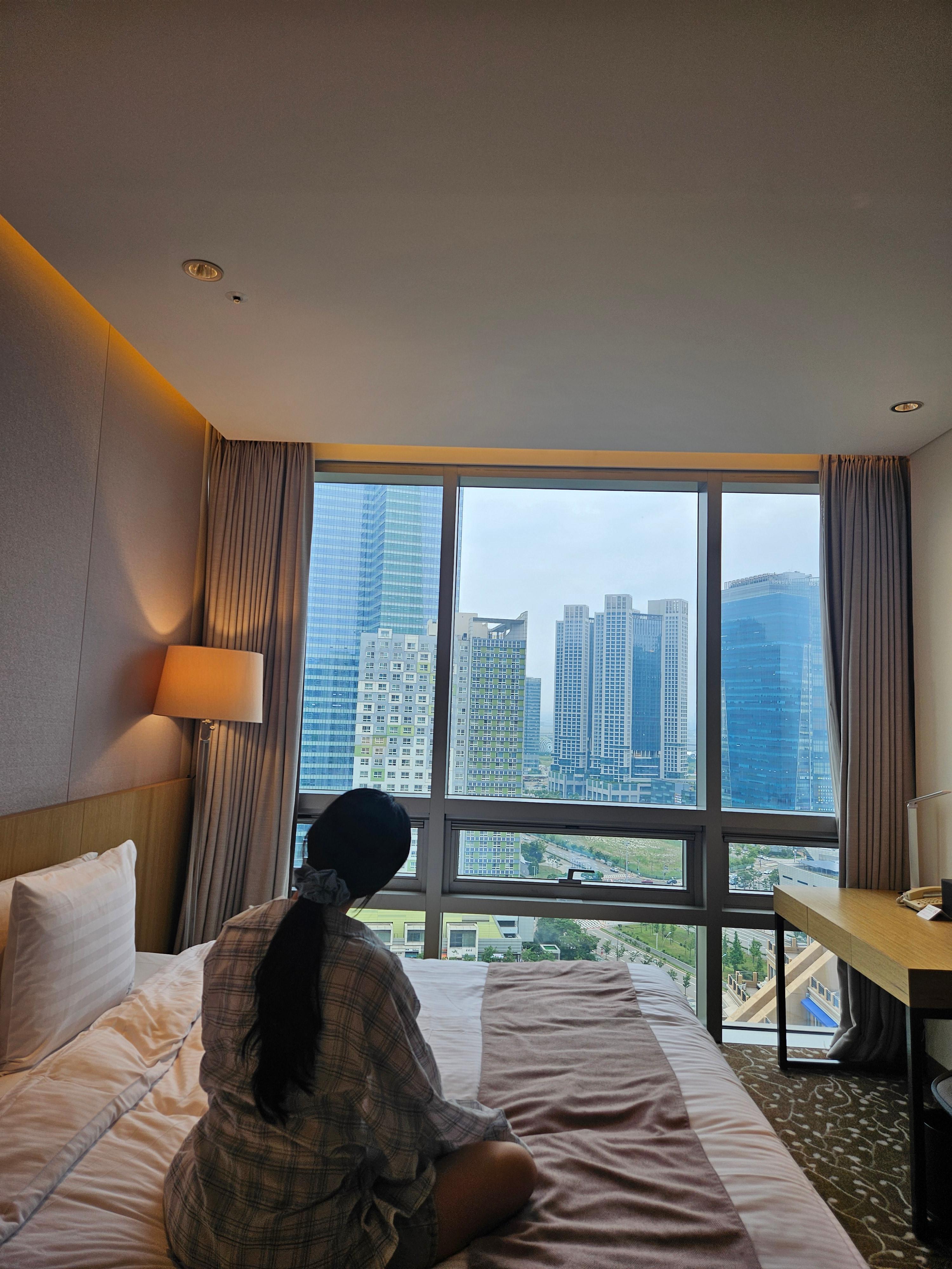객실은 냄새도 안나고 쾌적하고 밝고 맘에 쏙 들었어요. 침대는 프리미엄 킹 사이즈(?) 엄청 커서 성인 4명도 함께 누울수 있는 크기에 깨끗하고 모던한 분위기였어요. 넓은 통유리 창으로 보이는 송도 센트럴파크 전망은 정말 멋졌어요. 딸이 창가에 앉아 사진 찍느라 정신이 없었답니다.